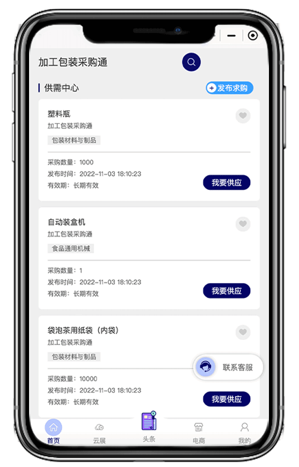 【加工包装采购通】小程序持续为买卖双方提供便捷的服务与沟通,您可在平台上找产品、找合作等贸易需求,实现高效贸易配对。